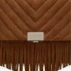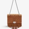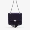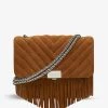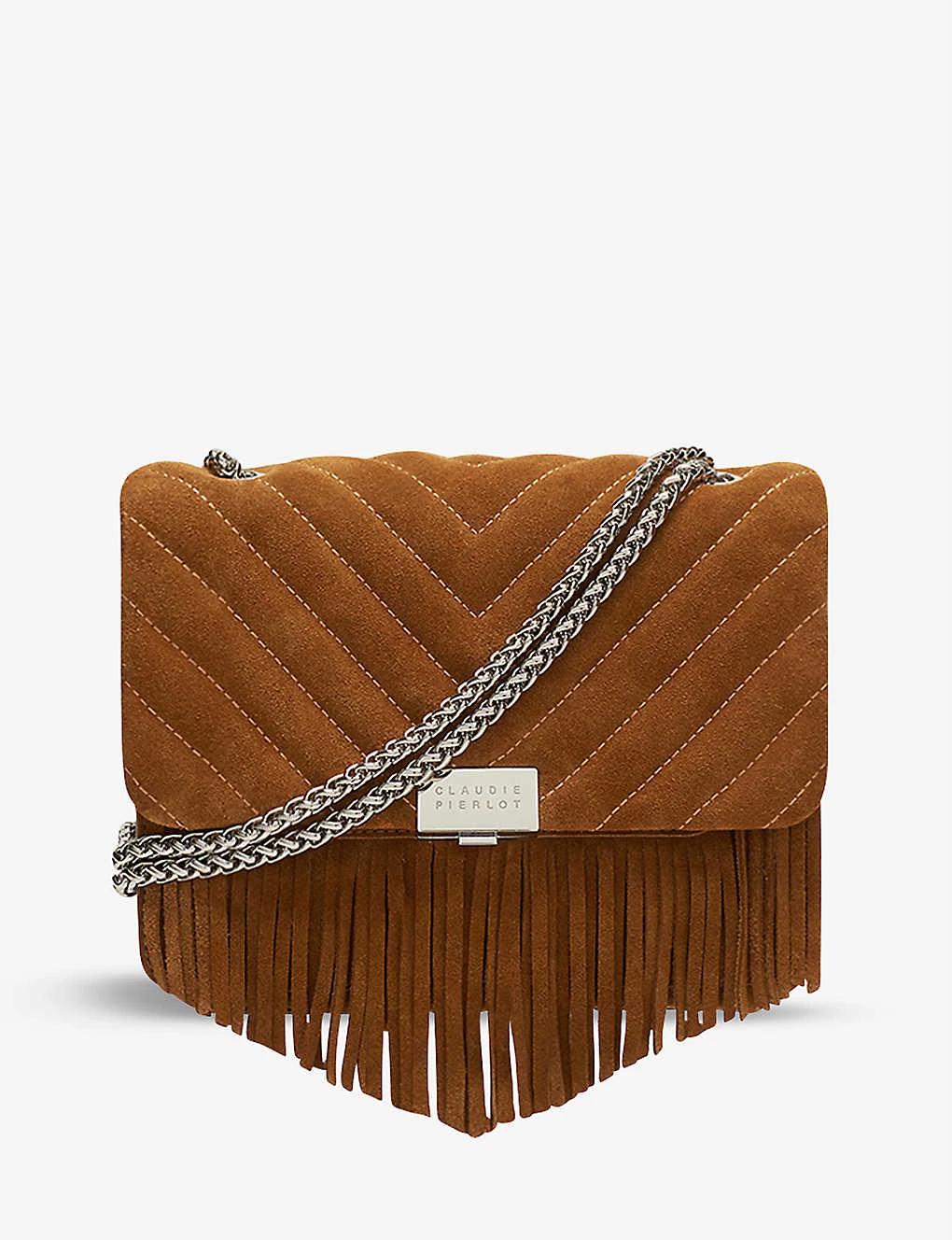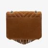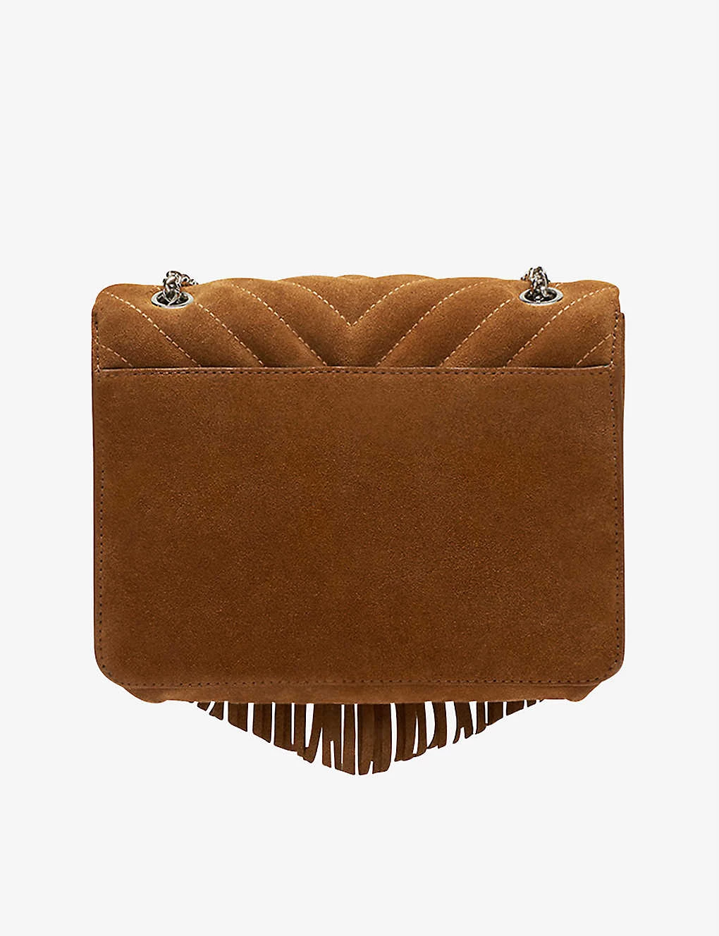 - Chevron quilting, fringed trim, adjustable chain straps, branding, rear slip pocket, dual-compartment interior, internal slip pocket