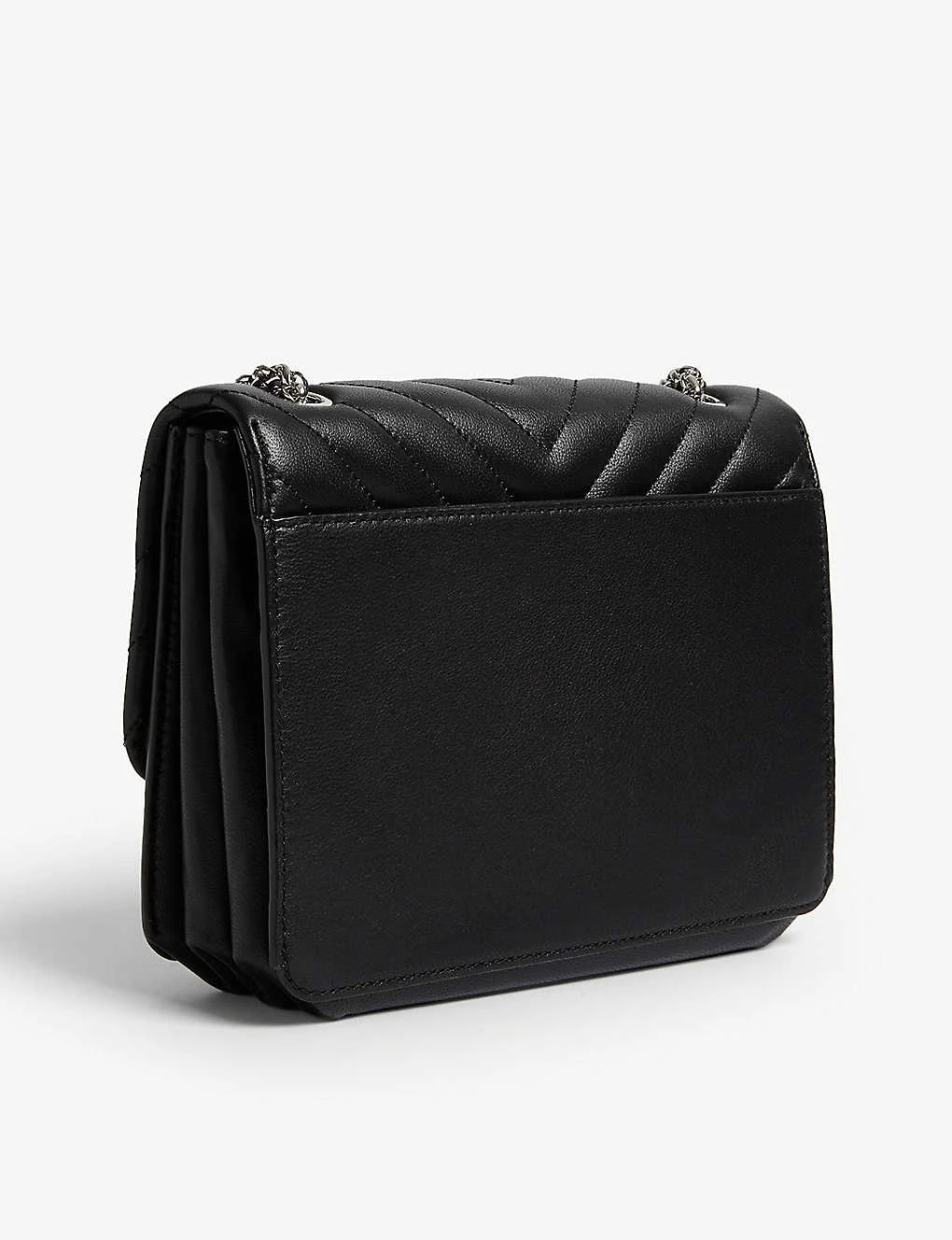 - Chevron quilting, adjustable chain straps, branding, rear slip pocket, dual-compartment interior, internal slip pocket