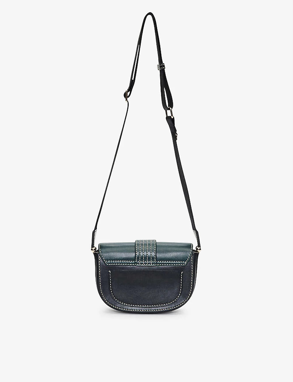 - Classic flap-over front, contrast topstitching, crossbody strap, gold-tone buckle detail, adjustable strap