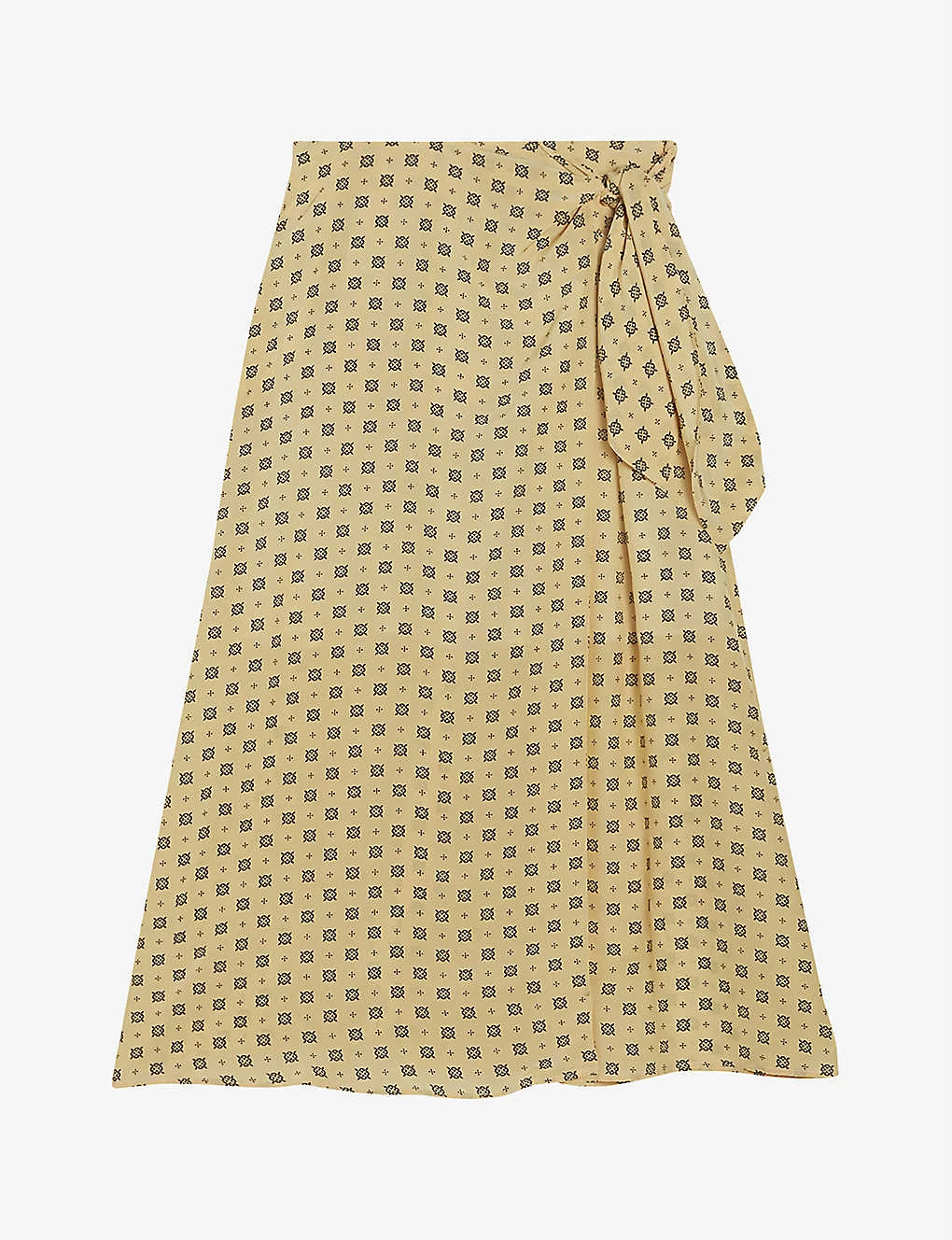 - High rise, midi length, asymmetric, geometric print, belt tie