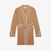 - V-neck, long sleeves, contrast trim, self-tie belt, rolled sleeves with button fastening, ribbed trim, gold-toned hardware, straight hem