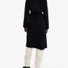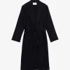 - Longline, mid-length, bathrobe-style, self-tie fastening, detachable belt, tonal design