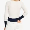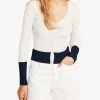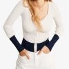 - V-neck, tonal front buttons, long sleeves, all-over ribbed knit, contrast trims at cuffs and hem