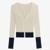 - V-neck, tonal front buttons, long sleeves, all-over ribbed knit, contrast trims at cuffs and hem