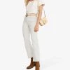 - High-rise, 5 pockets, tonal belt loops, contrast topstitching, tonal topstitching, branded yoke at back, straight-leg, faded wash