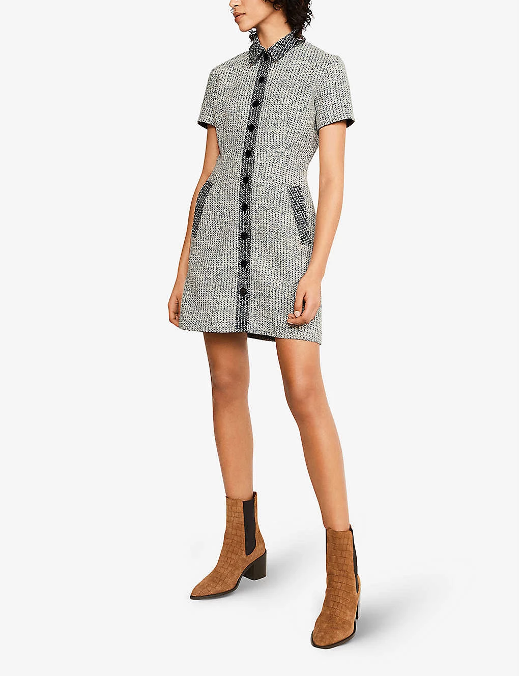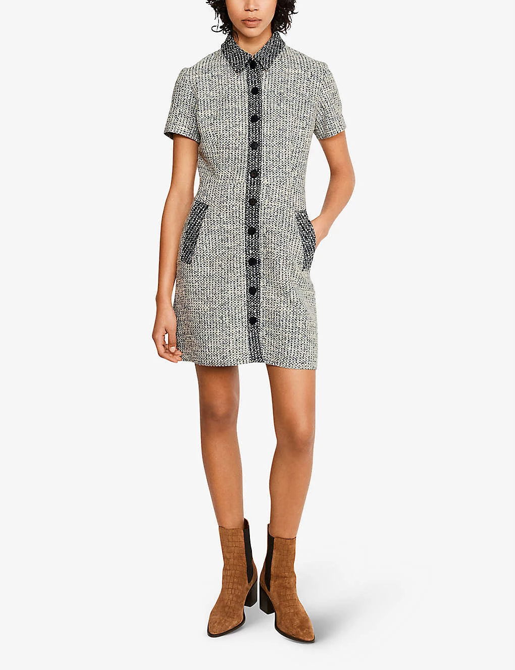 - Mini length, short sleeves, contrasting trims, classic shirt collar, button-through front, side slip pockets, fitted waist, fully lined, tweed fabrication