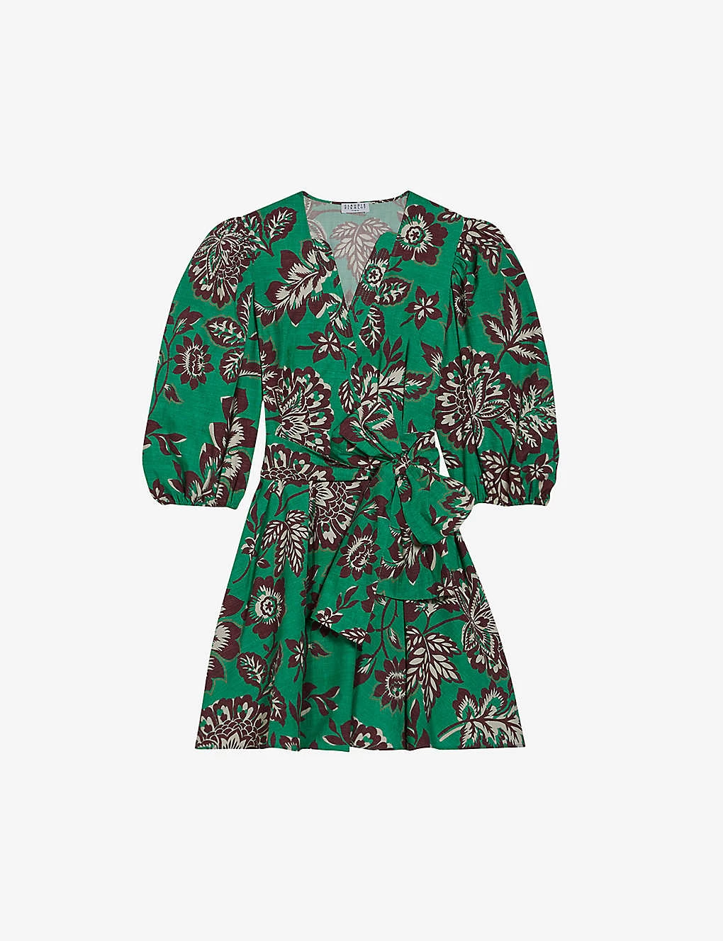 - V-neck, three-quarter length puff sleeves, all-over floral print, wrap front, self-tie belt at the waist, pleated skirt, mini length
