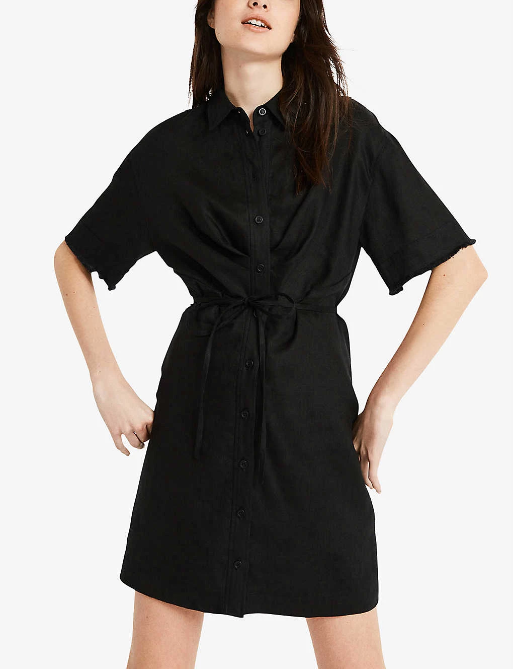 - Spread collar, wide short sleeves, tonal buttons, self-tie waist belt