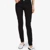 - Slim fit, high rise, skinny leg, belt loops, five pockets, V-shaped yoke at back, branded hardware