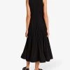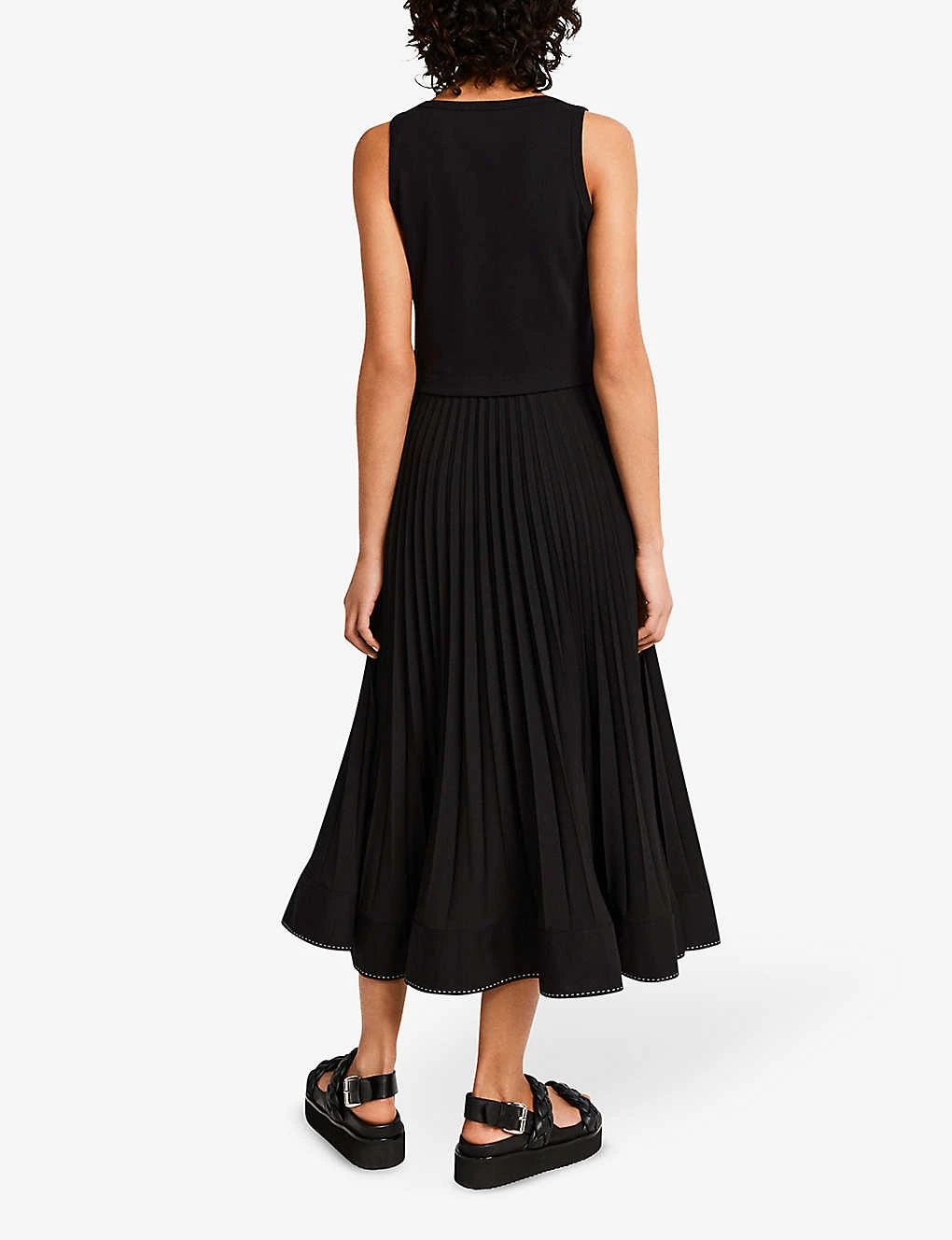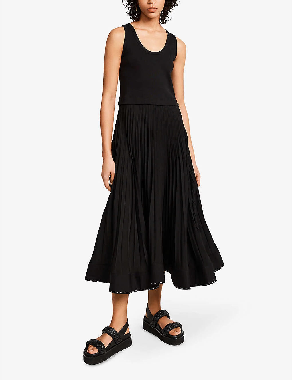 - Round neck, ribbed vest, sleeveless, pleated flared skirt, contrast topstitching at hem