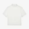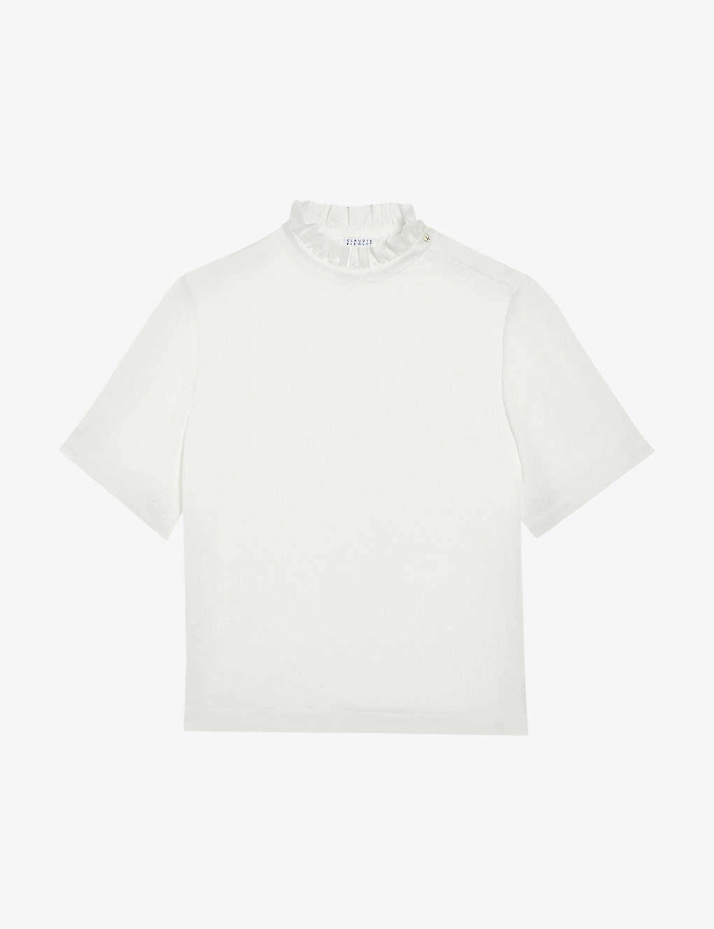 - High neckline, ruffle collar, short sleeves, textured fabric, loose-fit, straight cut